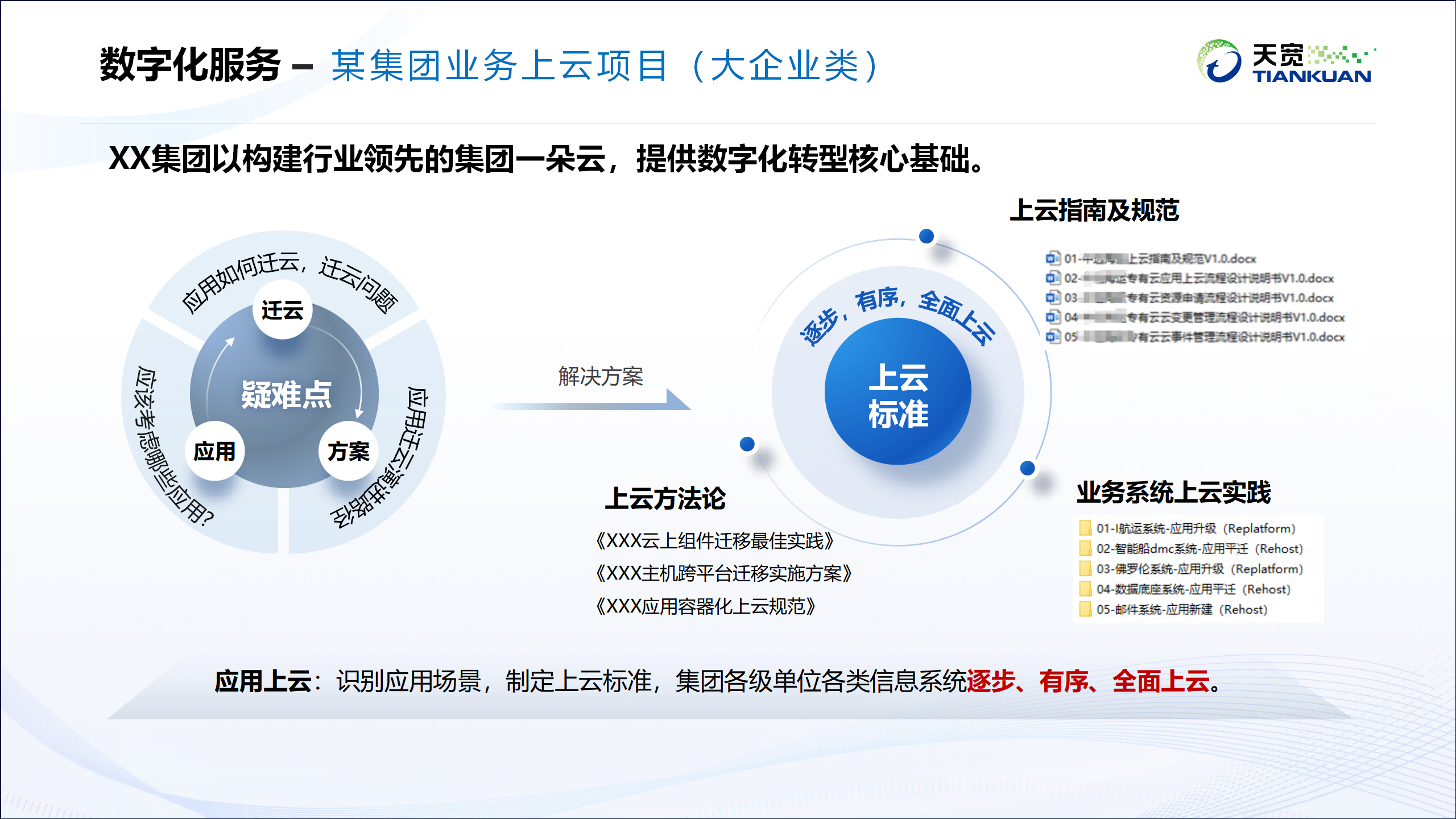 通過識(shí)別應(yīng)用場(chǎng)景,制定上云標(biāo)準(zhǔn),實(shí)現(xiàn)XX集團(tuán)各級(jí)單位各類信息系統(tǒng)逐步、有序、全面上云,實(shí)現(xiàn)數(shù)字化轉(zhuǎn)型核心基礎(chǔ)的成功建設(shè)。