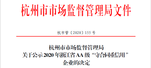 近日,2020年浙江省AA級“守合同重信用”企業(yè)名單公示,天寬榜上有名。這也是公司首次申報浙江省“守合同重信用”企業(yè),并獲準直接參加AA級評定。
