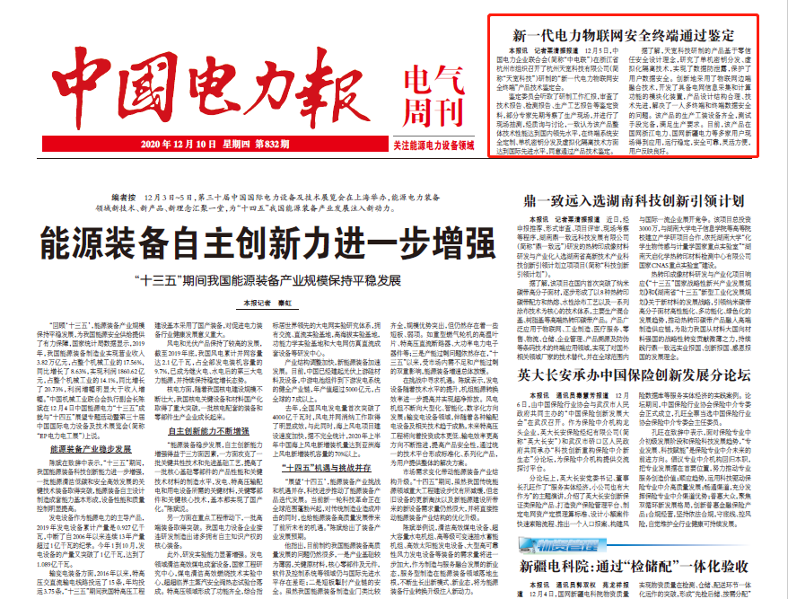 12月10日,《中國電力報》頭版刊發(fā)了關(guān)于天寬順利通過產(chǎn)品鑒定會的詳細報道。