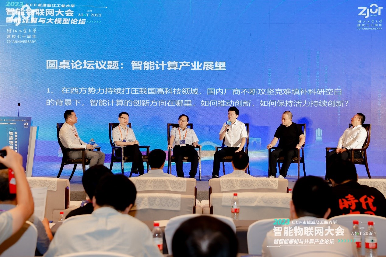 在圓桌論壇環(huán)節(jié),杭州天寬科技有限公司副總經(jīng)理張?jiān)?span>AIII人工智能產(chǎn)業(yè)研究院院長(zhǎng)朱兆穎、浙江工業(yè)大學(xué)計(jì)算機(jī)科學(xué)與技術(shù)學(xué)院副院長(zhǎng)陳鐵明、華為云計(jì)算技術(shù)有限公司數(shù)字化轉(zhuǎn)型總監(jiān)胡明超、安恒信息技術(shù)有限公司研究院副院長(zhǎng)稅雪飛、杭州加減智能科技有限公司總經(jīng)理彭帥6位嘉賓,以“智能計(jì)算產(chǎn)業(yè)展望”為話(huà)題,共同探討了當(dāng)前國(guó)際形勢(shì)下,如何推動(dòng)智能計(jì)算的創(chuàng)新,政府如何制定政策以解決智能計(jì)算產(chǎn)業(yè)發(fā)展帶來(lái)的數(shù)據(jù)安全、隱私保護(hù)、能源消耗、崗位替代等社會(huì)問(wèn)題。