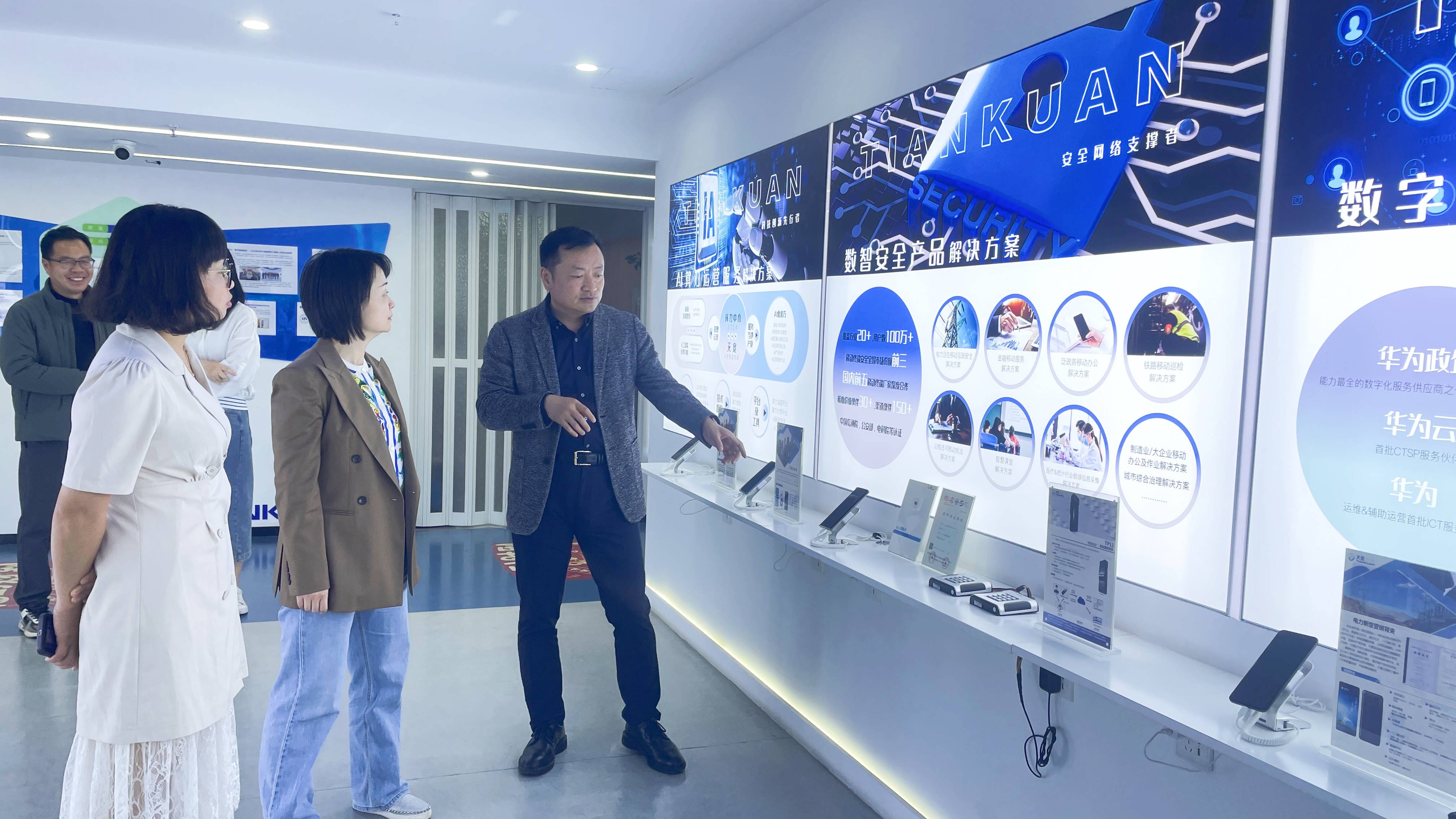 座談會(huì)后,何芳一行在張?jiān)呐阃?,參觀了天寬展廳和企業(yè)文化墻。