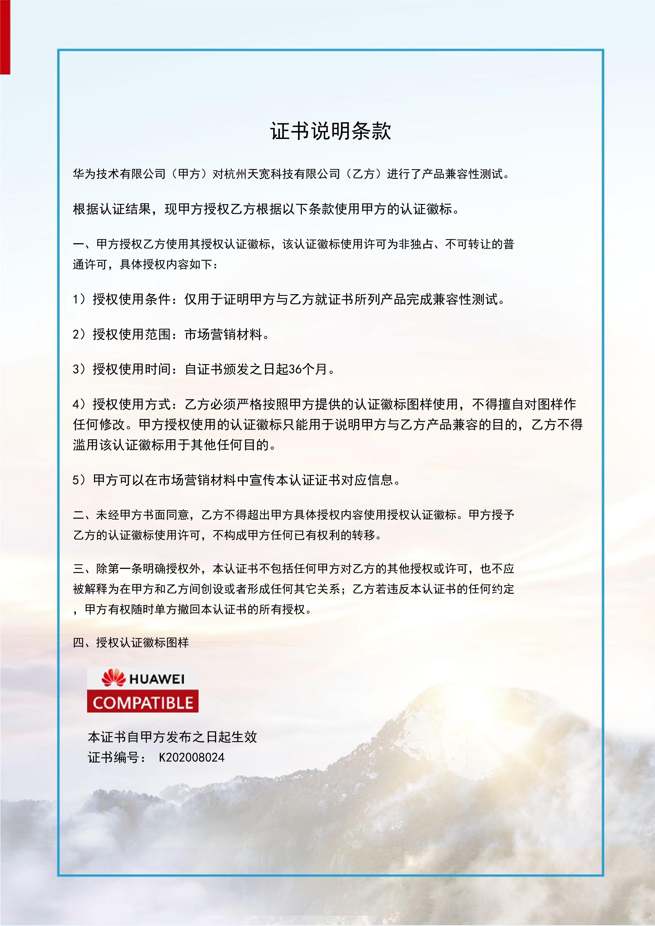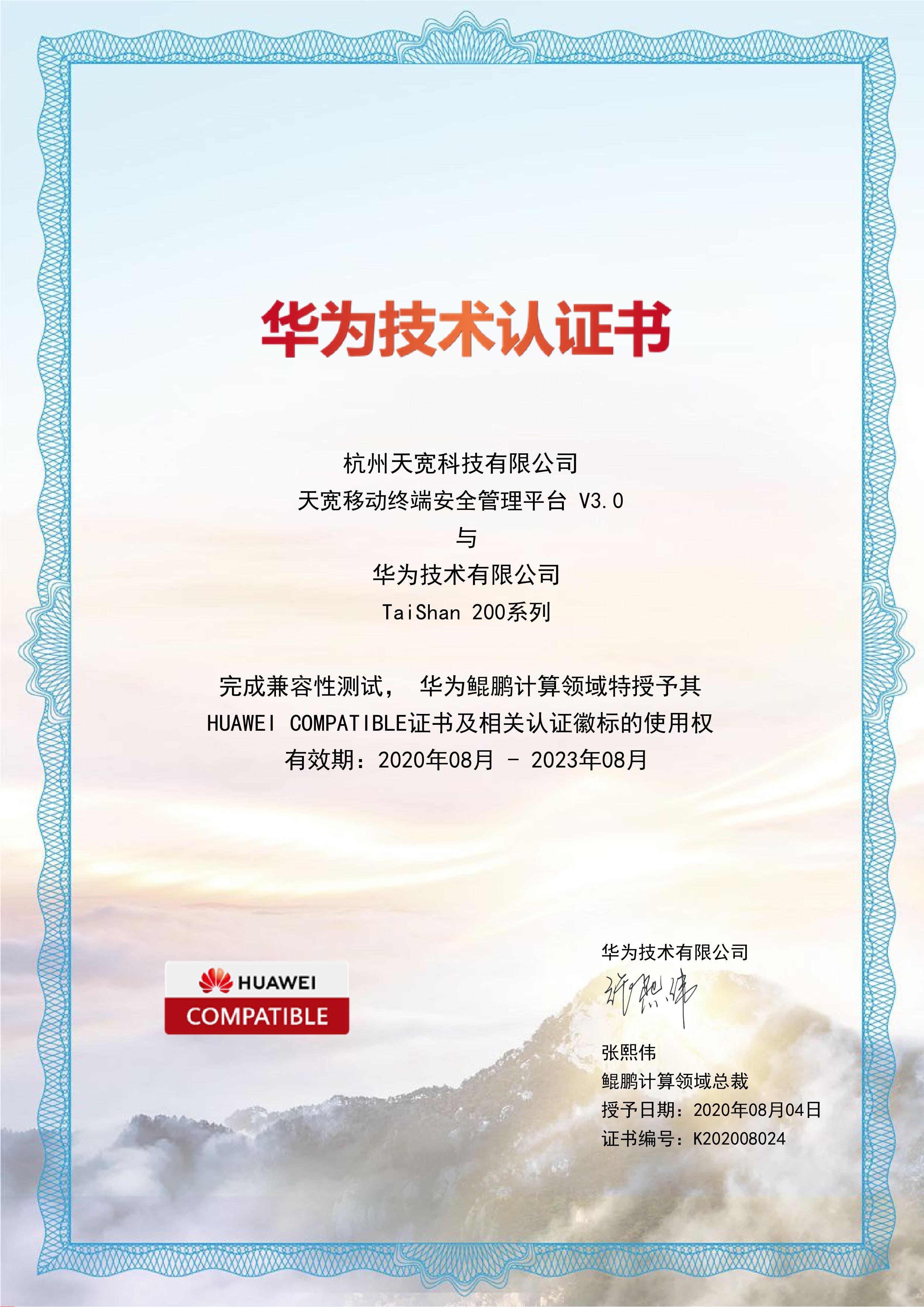 2020年8月4日,天寬移動終端安全管理平臺V3.0通過了華為技術有限公司TaiShan200系列的兼容性認證,被華為鯤鵬計算領域授予HUAWEI COMPATIBLE證書及相關認證徽標的使用權。