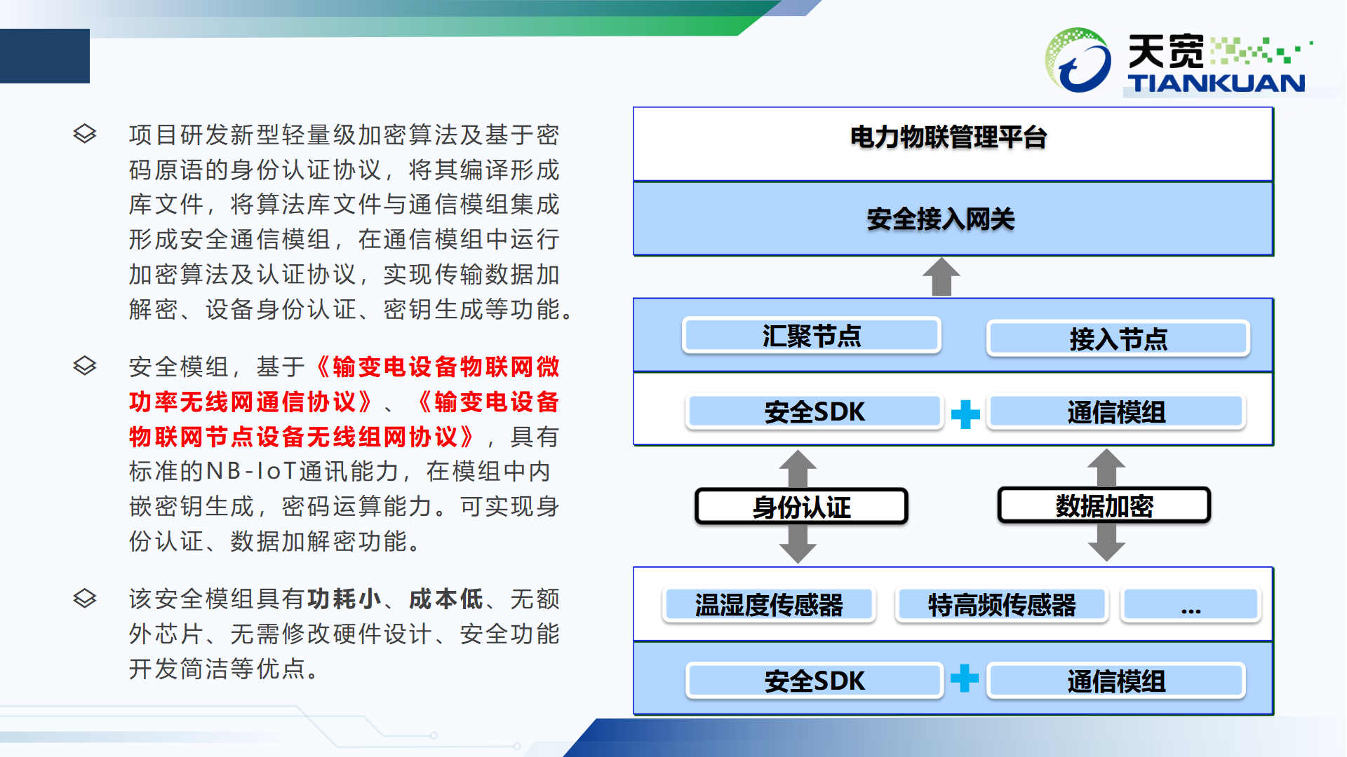 物聯(lián)網(wǎng)加密模組基于《輸變電設(shè)備物聯(lián)網(wǎng)微功率無線網(wǎng)通信協(xié)議》、《輸變電設(shè)備物聯(lián)網(wǎng)節(jié)點(diǎn)設(shè)備無線組網(wǎng)協(xié)議》,具有標(biāo)準(zhǔn)NB-IoT通訊能力,在模組中內(nèi)嵌密鑰生成、密碼運(yùn)算能力,可實(shí)現(xiàn)身份認(rèn)證、數(shù)據(jù)加解密功能,同時具有功耗小、成本低、無額外芯片、無需修改硬件設(shè)計(jì)、安全功能開發(fā)簡潔等優(yōu)勢??梢苑奖愕貙⑽⒐β省⒌凸膫鞲衅鹘尤氲诫娏ξ锫?lián)網(wǎng)無線通信網(wǎng)絡(luò)中。廣泛地應(yīng)用在電力物聯(lián)網(wǎng)中的微功率、低功耗傳感器上。