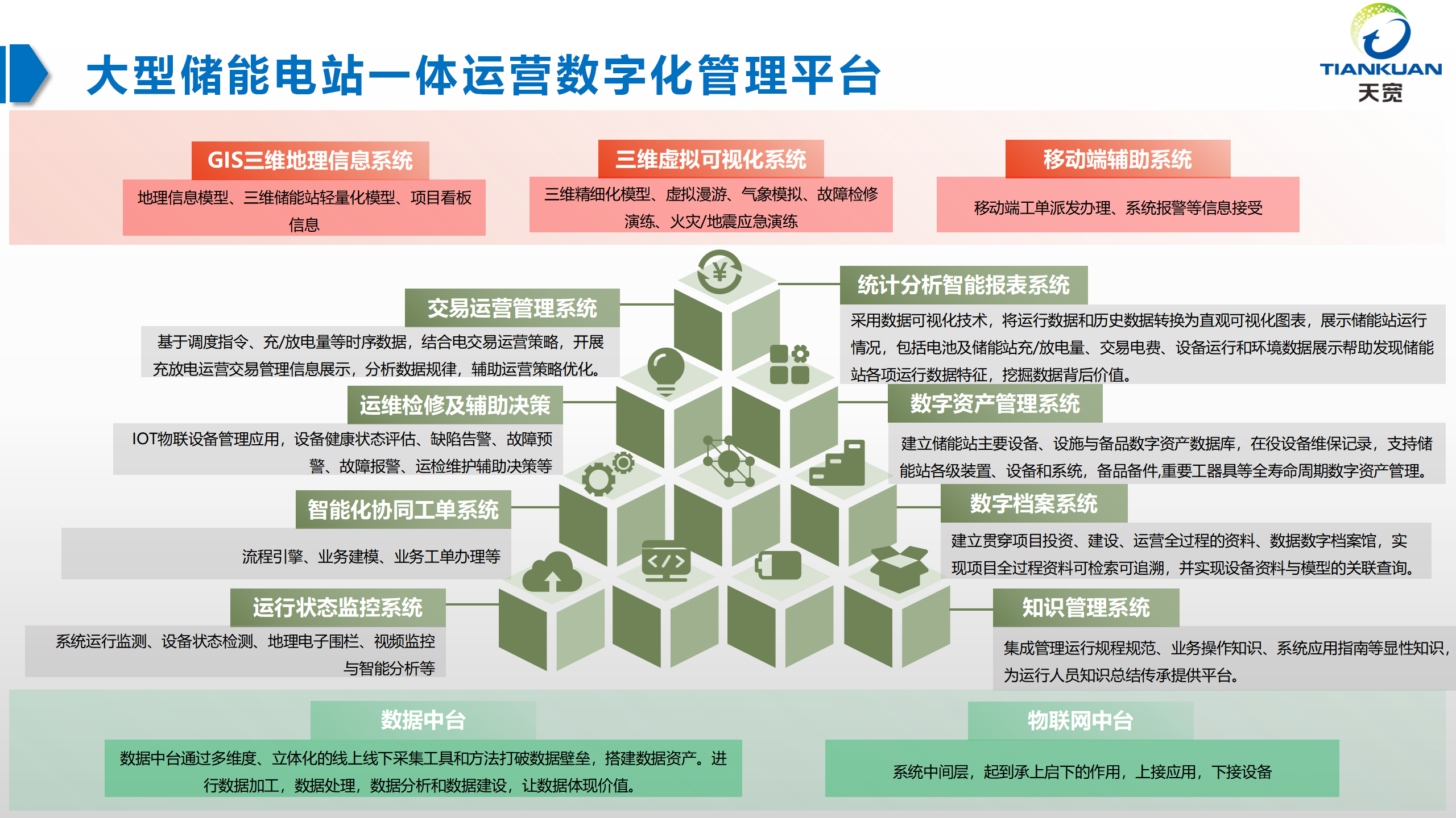 新能源統(tǒng)一運營平臺可匹配光伏、風電等新能源系統(tǒng),包含集成監(jiān)控系統(tǒng)、能量管理系統(tǒng)、電池管理系統(tǒng)、火災報警系統(tǒng)、視頻安防監(jiān)控系統(tǒng)、電子圍欄等系統(tǒng)數據與視頻等智能IOT 設備,可對環(huán)境數據采集、監(jiān)測電纜運行、設備外部溫度等狀態(tài),實現對新能源設備運行數據的采集,并對新能源系統(tǒng)進行能量轉移、調頻服務、削峰填谷、調峰應用等。在電力調度部門的監(jiān)控和指揮下,通過儲能站能量管理系統(tǒng) EMS進行集中控制。