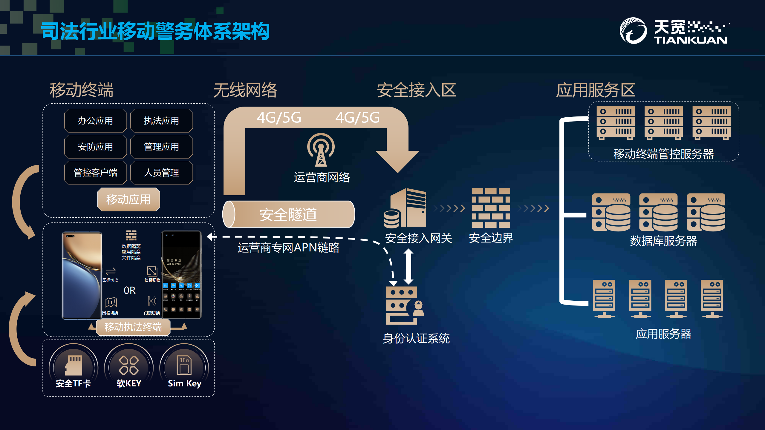 移動終端管理平臺是為移動警務(wù)信息化建設(shè)提供終端統(tǒng)一安全管理的平臺,其目的旨在解決移動警務(wù)場景下的警務(wù)終端安全、應(yīng)用管理、文檔共享和統(tǒng)一配置問題。搭配使用搭載天寬雙域安全平臺的制定智能終端,以隔離、管控、加密方式,在確保數(shù)據(jù)安全,防止涉密信息泄露的基礎(chǔ)上,實(shí)現(xiàn)辦公移動化,增強(qiáng)司法管理工作機(jī)動性,實(shí)現(xiàn)管理“智慧化”,提高管理運(yùn)營水平。